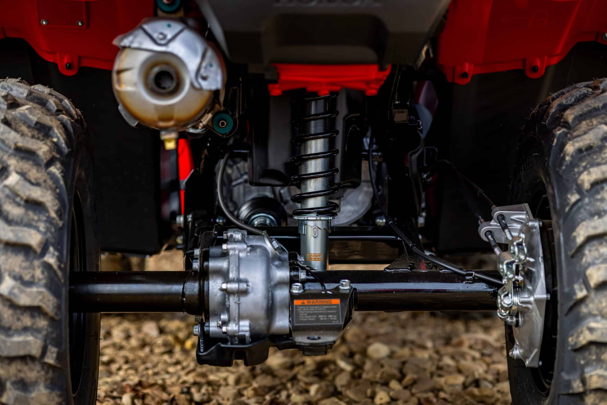 Swingarm with single shock – durability and minimal body roll for heavy utility use.